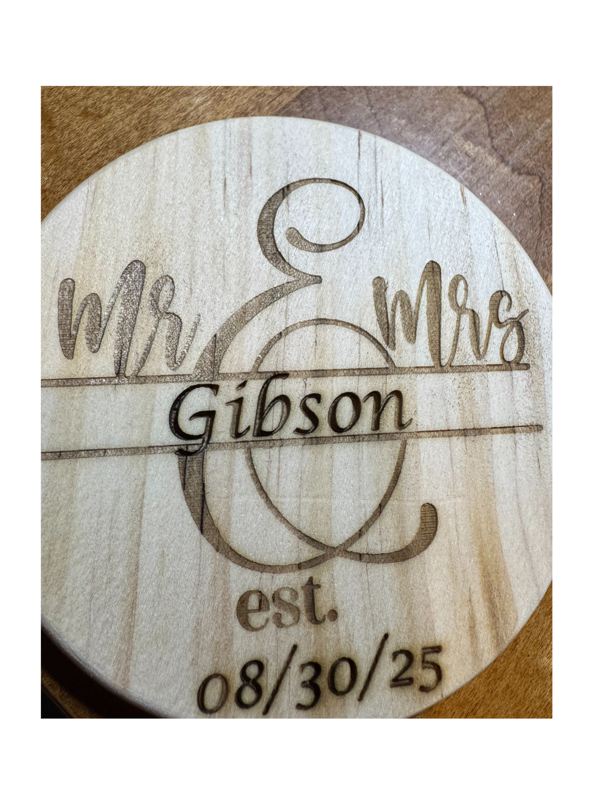 These custom engraved pine wood coasters make the perfect wedding or anniversary gift. With the name and date added into the Mr & Mrs monogram they are a gift that will be cherished and used! Sealed with mineral oil, so they do not lose the ability to soak up water. This set comes in a 4 pack, but other quantities are available.